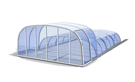 Mehrstufige Poolüberdachung im Korbbogen-Design mit hoher Front und hinteren Segmenten im Stil Florida Small. Erhältlich mit massiver oder Mehrsteg-Polycarbonatverglasung sowie mit Schiebe- oder Drehtüren.