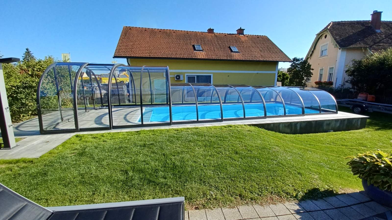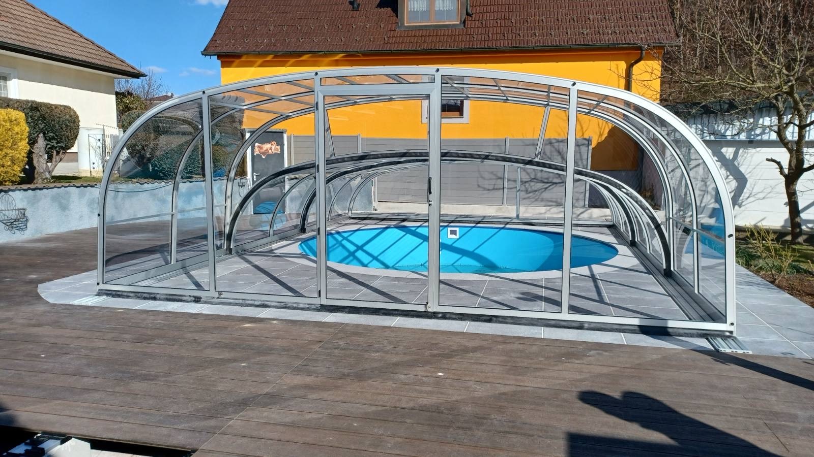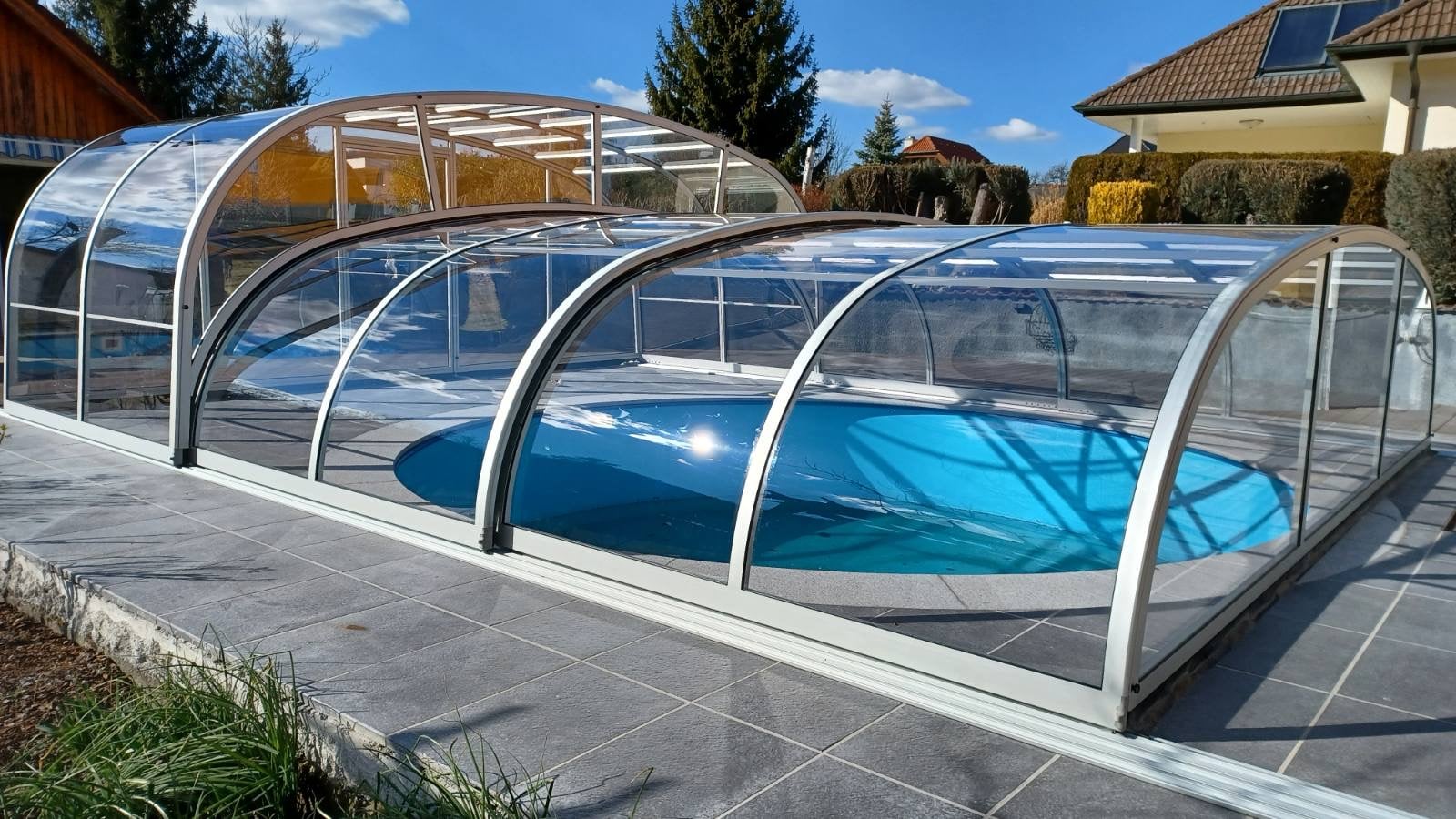 Mehrstufige Poolüberdachung im Korbbogen-Design mit hoher Front