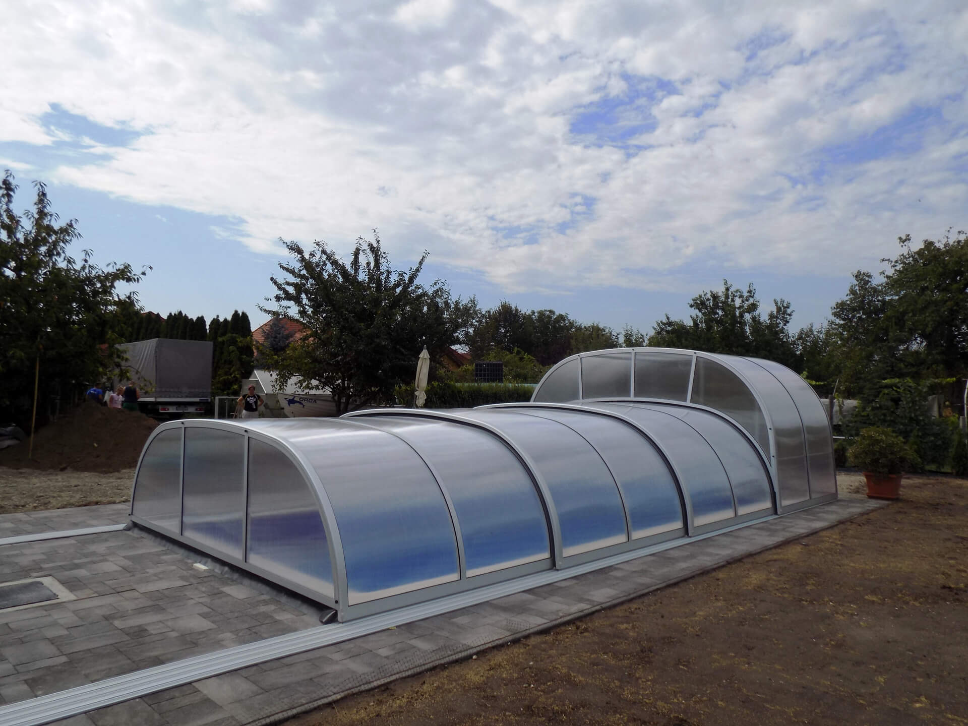 Mehrstufige Poolüberdachung im Korbbogen-Design mit hoher Front. Die hinteren Segmente sind im Stil Florida Small ausgeführt. Schiebe- oder Drehtüren seitlich oder an der Frontwand möglich. Ausführung mit Mehrsteg- oder massiver, klarer Polycarbonatverglasung.
