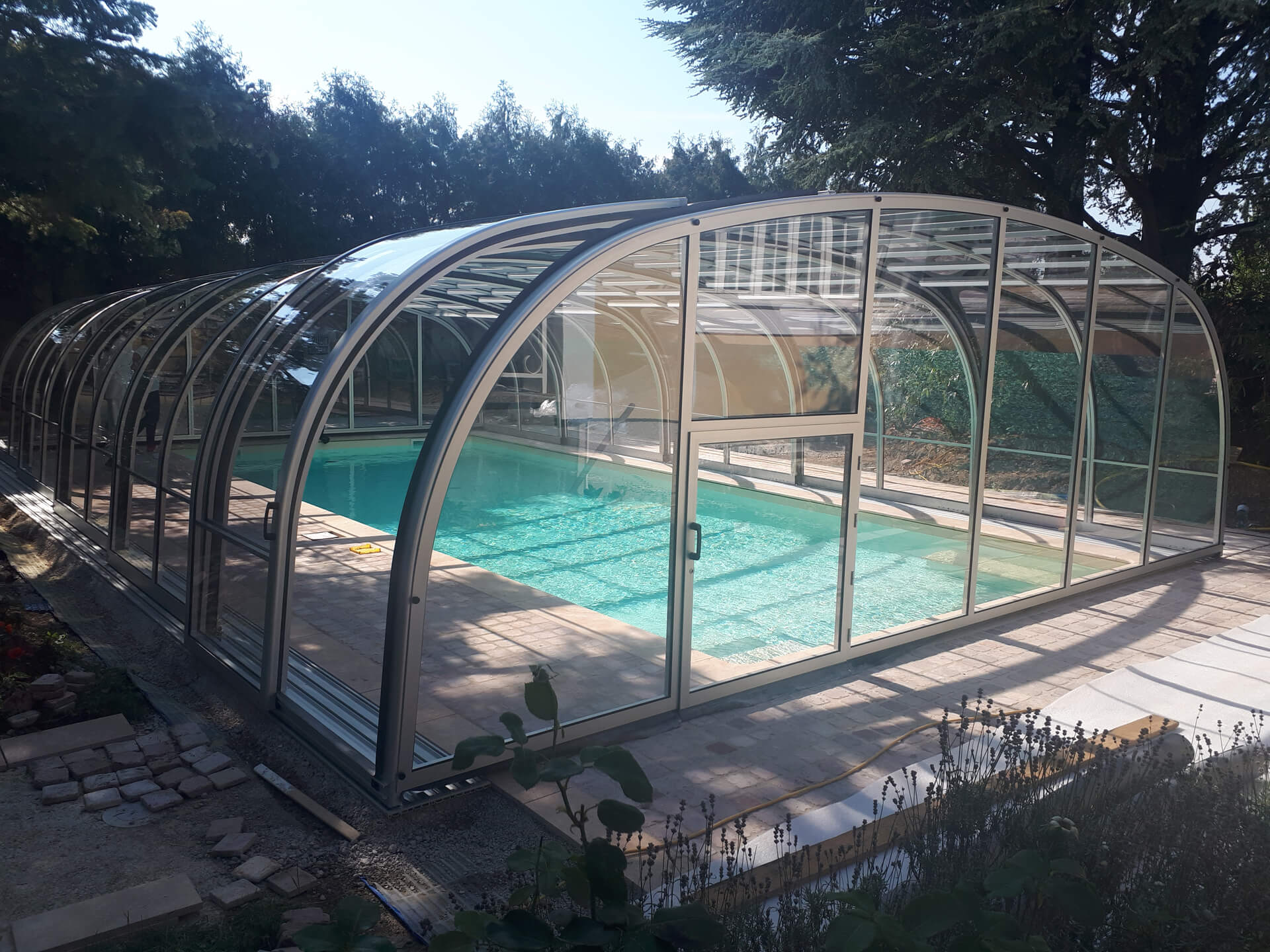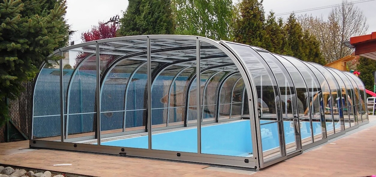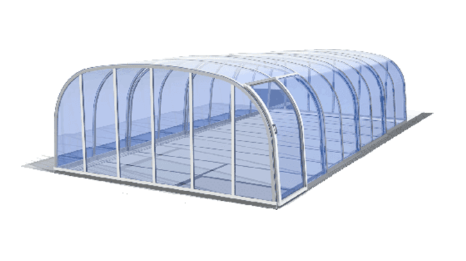 Hohe Poolüberdachung im Korbbogen-Design mit Schiebetür, erhältlich mit massiver oder Mehrsteg-Polycarbonatverglasung. Ideal für komfortable Nutzung des Poolbereichs und ganzjährigen Betrieb.
