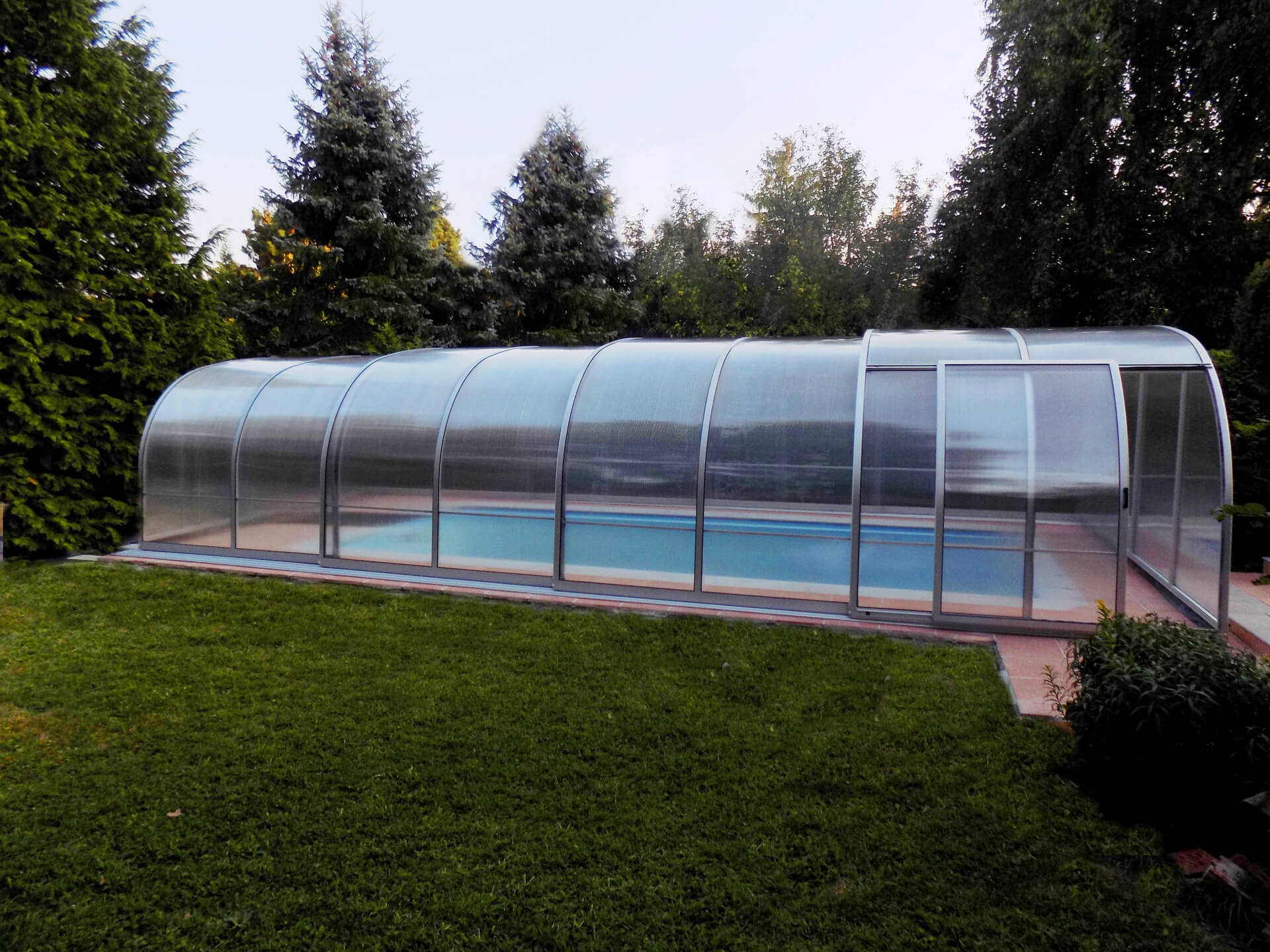 Hohe Poolüberdachung im Korbbogen-Design mit Schiebetür. Ausführung mit Mehrsteg- oder massiver, klarer Polycarbonatverglasung möglich.