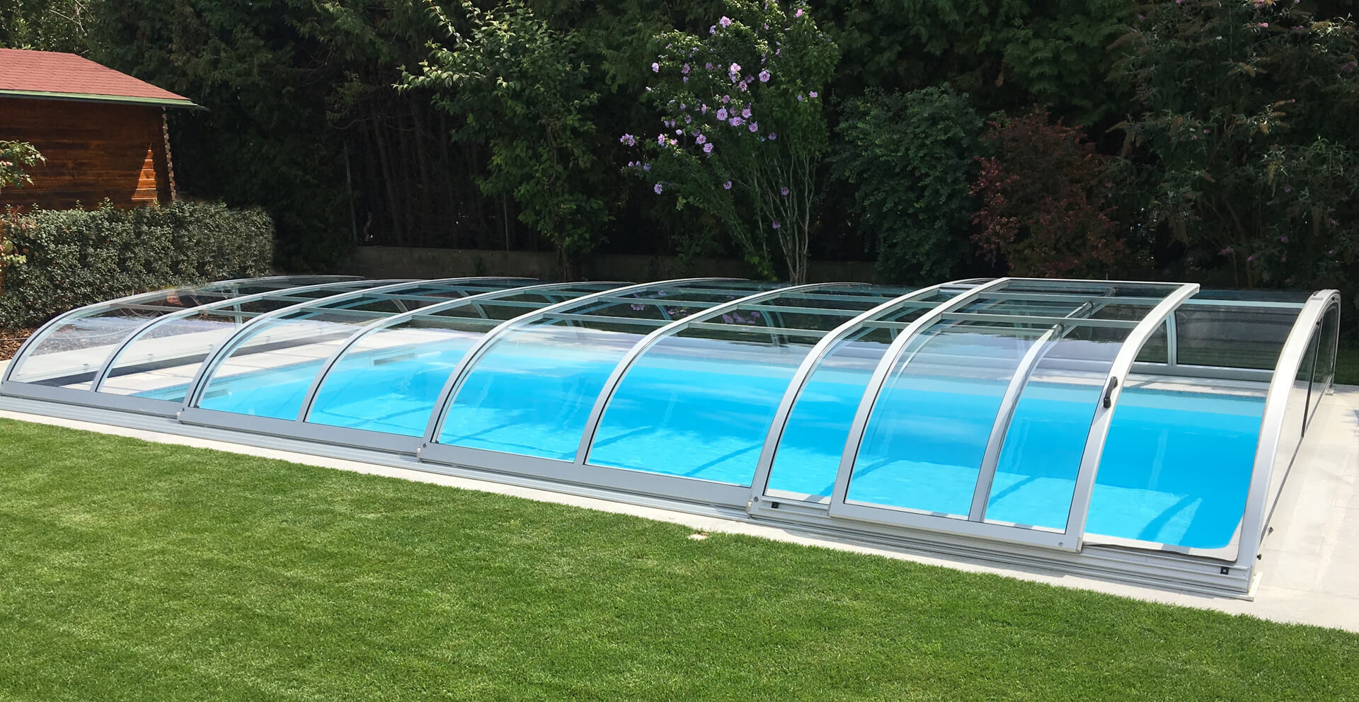 Niedrige Poolüberdachung im Korbbogen-Stil mit Schiebetür. Ausführung mit Mehrsteg- oder massiver, klarer Polycarbonatverglasung möglich.
