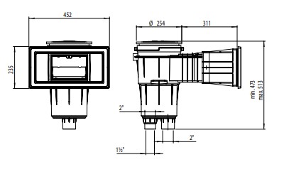 Pripojenie sacieho hrdla: 1 ½” vnútorný závit; hlavný odtok: 2” vnútorný závit; prepad: Ø 32 mm.