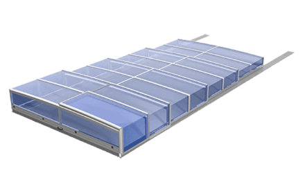 Moderný, minimalistický štýl, zvýšené, hranaté bazénové zastrešenie s posuvnými dverami. Iba s plným, čírym polykarbonátovým zasklením. Možnosť vyhotovenia s jednostrannou koľajnicou (do šírky 5 m).