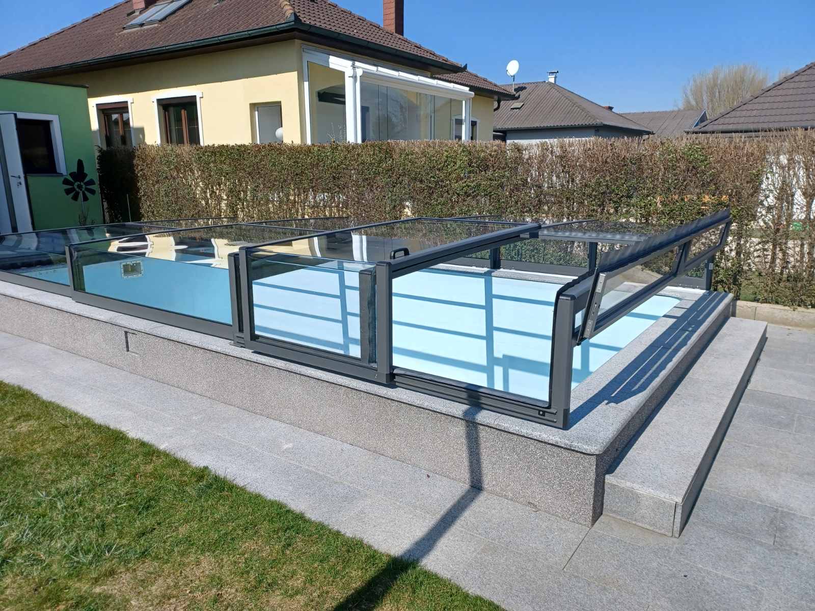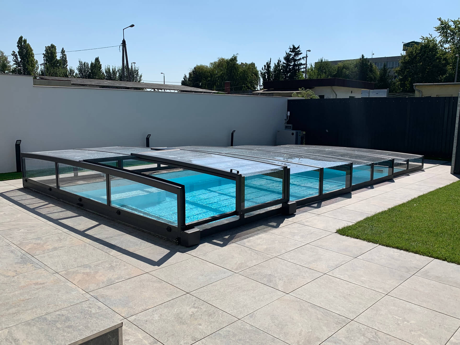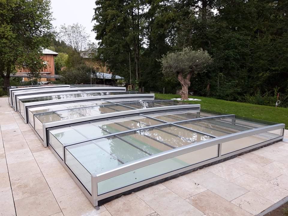- Moderné, zvýšené, hranaté bazénové zastrešenie s posuvnými dverami